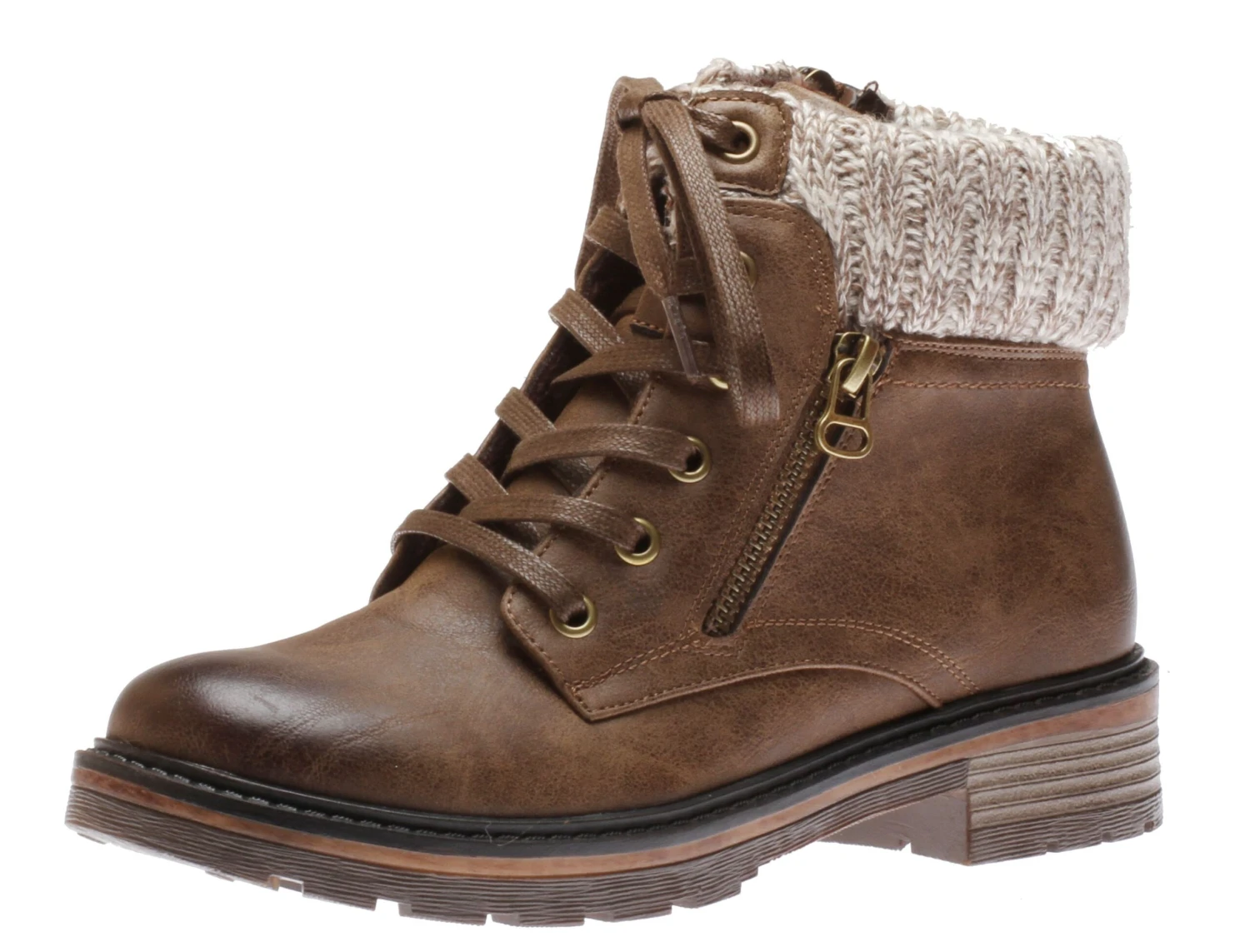 Keep it fashionable and functional donning these Wanderlust Amy Dark Ten boots. Wear these boots with your favourite jeans and sweater for a laid-back look. These boots feature a distressed synthetic leather upper with burnished details on toe and heel and a ankle-high shaft with sweater detail on the collar. The boot also features a decorative diagonal zipper on the outside, convenient functional zipper on the side and five-eyelet lace-up closure for a secure fit and for an easy on and off.