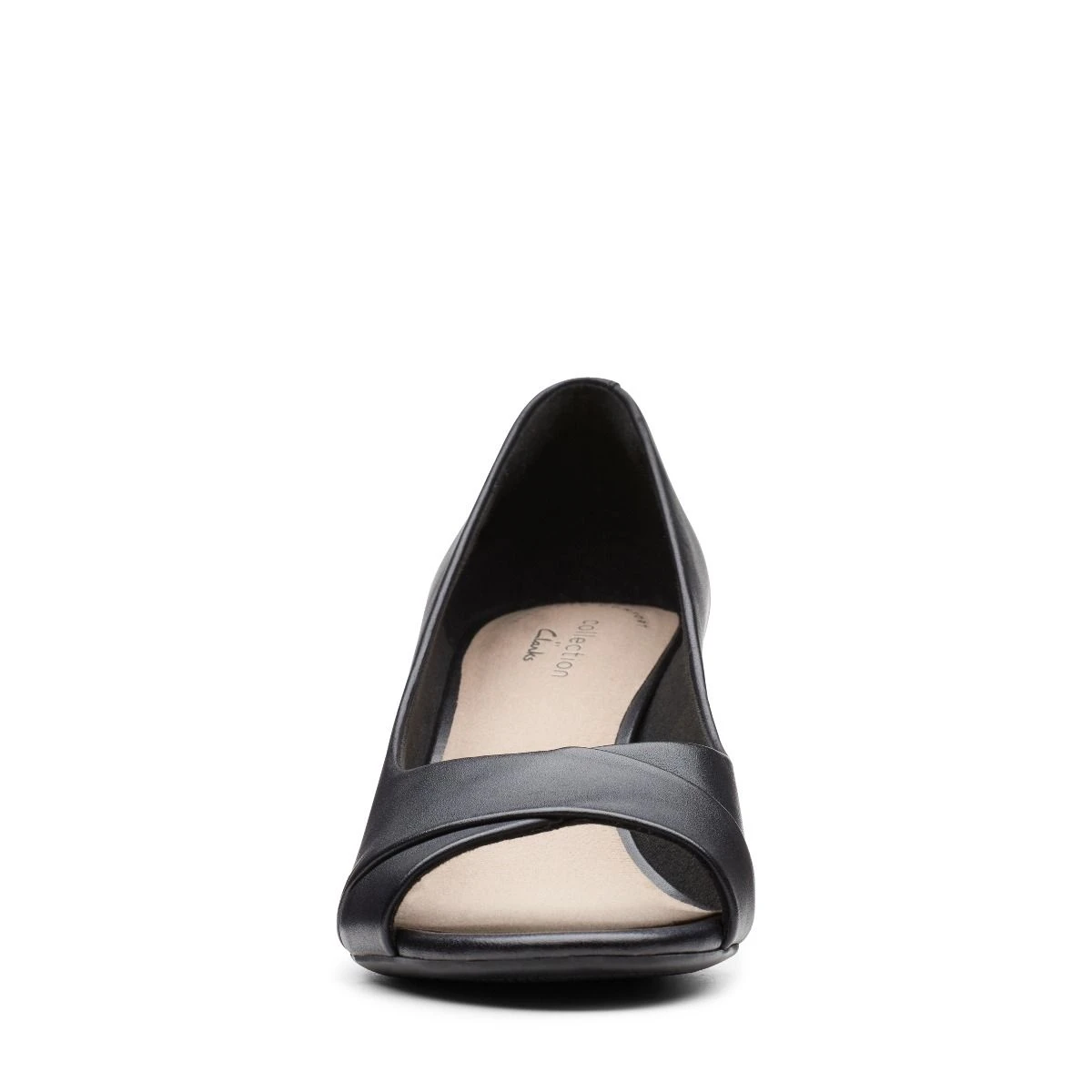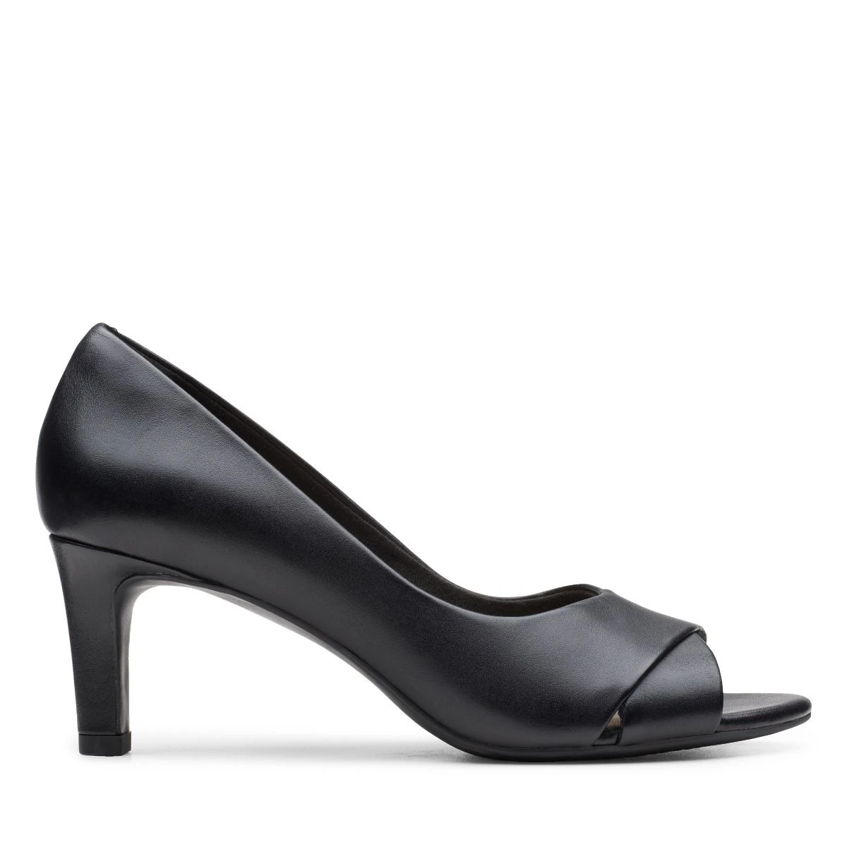 The Clarks Alice Fern in black is an elegant peep-toe high heel with crisscross straps at the front in a slip-on silhouette. This is a comfortable high heel you can wear all day! It features a soft leather upper, soft microfiber lining and Cushion Soft™ technology with OrthoLite® footbed ensures comfort with every step. Wear to dress up for an elegant evening out or a day at the office.