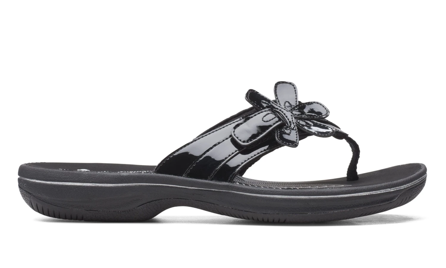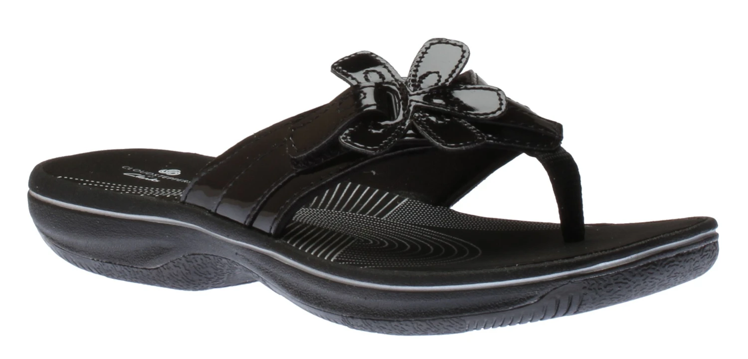 Pack light, step lighter. The Cloudsteppers™ Brinkley Flora flip flop sandal comes in black patent with a floral embellishment for a look and feel that’s as fun as summer should be. A cushioned EVA midsole and footbed support and protect the foot from shells and beach pebbles without adding any extra weight.