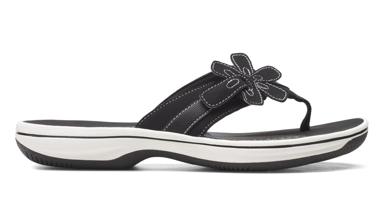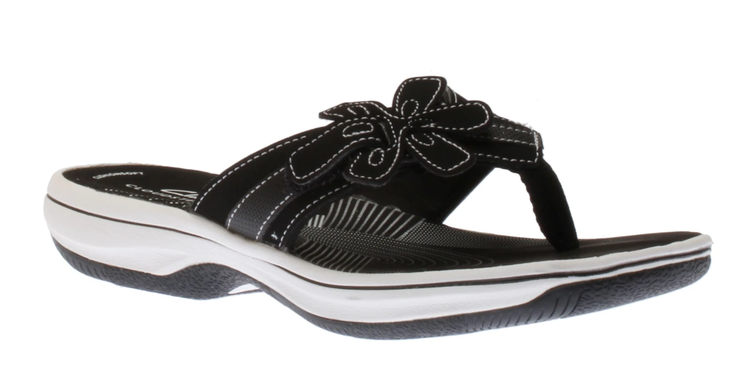 Pack light, step lighter. The Cloudsteppers™ Brinkley Flora flip flop sandal comes in black and white with a floral embellishment for a look and feel that’s as light and as fun as summer should be. A cushioned EVA midsole and footbed support and protect the foot from shells and beach pebbles without adding any extra weight.