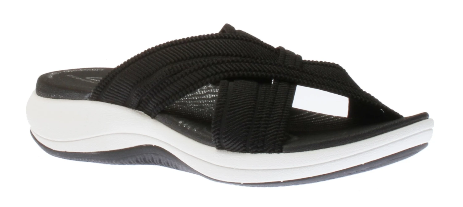 With a super soft EVA footbed delivering the comfort expected from Cloudsteppers collection by Clarks, the Mira is simple, lightweight and easy to wear, while the black and white color pops spark interest and make this wearable sandal even more fun.These are the perfect slide sandals for sunny spring and summer days!