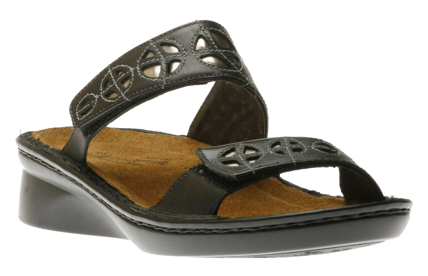 The Cornet from Naot’s Allegro Collection is a fully adjustable slide sandal with two adjustable hook and loop straps with Velcro closure that will be perfect to slip on and wear while running errands or while you’re at home. This chic slide sandal features a beautiful stitch design on a leather upper and a removable, anatomic cork and latex footbed wrapped in pampering suede that molds to the shape of the foot with wear. The sandal also features a polyurethane sole which is extremely lightweight and durable.