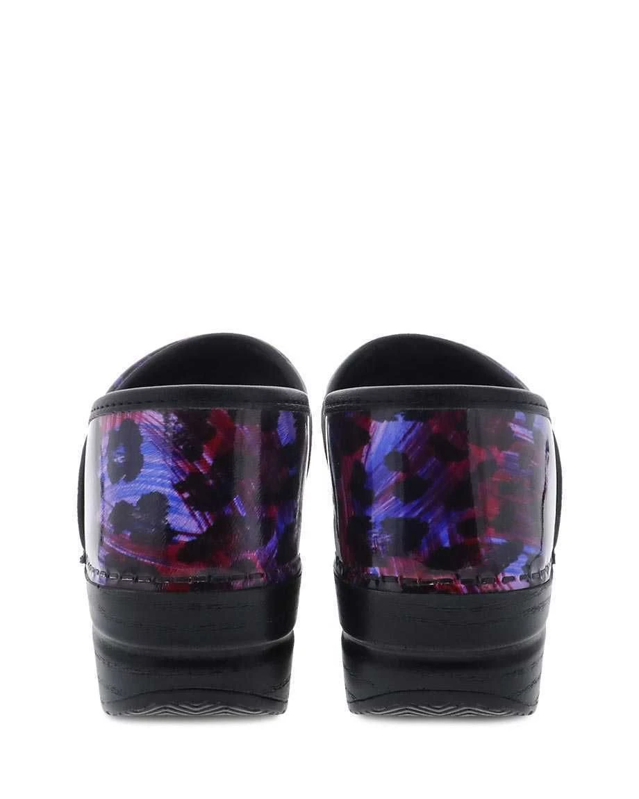 The Dansko Painted Leopard professional clog will brighten up your work day. The Dansko Professional is the Dansko flagship clog. The patent leather clog features a fresh, purple painted leopard patterned upper that will add a pop of color to your scrubs, uniform or even your casual t-shirt and jeans. Inside its iconic silhouette is a roomy reinforced toe box, an anatomically contoured PU midsole, an inner frame for stability and support, a padded instep collar, and a protective heel counter that allows the heel to move up and down freely while providing lateral stability. The anti-fatigue rocker bottom assists with forward motion while walking to add hours of comfortable support throughout your day. Wear this leather slip on professional work clog with anything in your closet, from slacks to scrubs and everything in between.