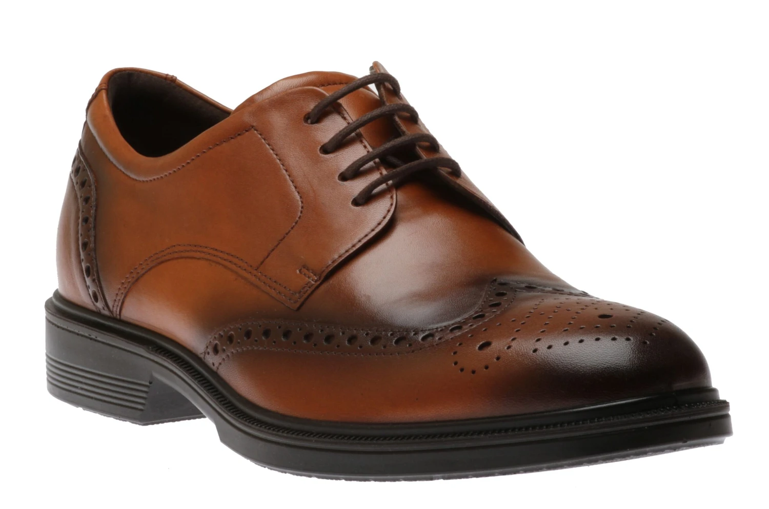 This classic Lisbon brogue dress shoe is crafted from full-grain leather and features adjustable laces for a secure comfortable fit. Inside, a removable leather-covered inlay sole is enhanced with the Ecco Comfort Fibre System™, which circulates air to keep feet fresh and dry. A tough but lightweight direct-injected polyurethane outsole provides secure comfortable traction.