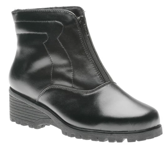 This contemporary boot features a sleek leather upper with stitching details for enhanced style. A front zipper provides an easy on-and-off while a warm lining ensures optimal comfort. A durable lugged sole delivers secure grip and stable traction.