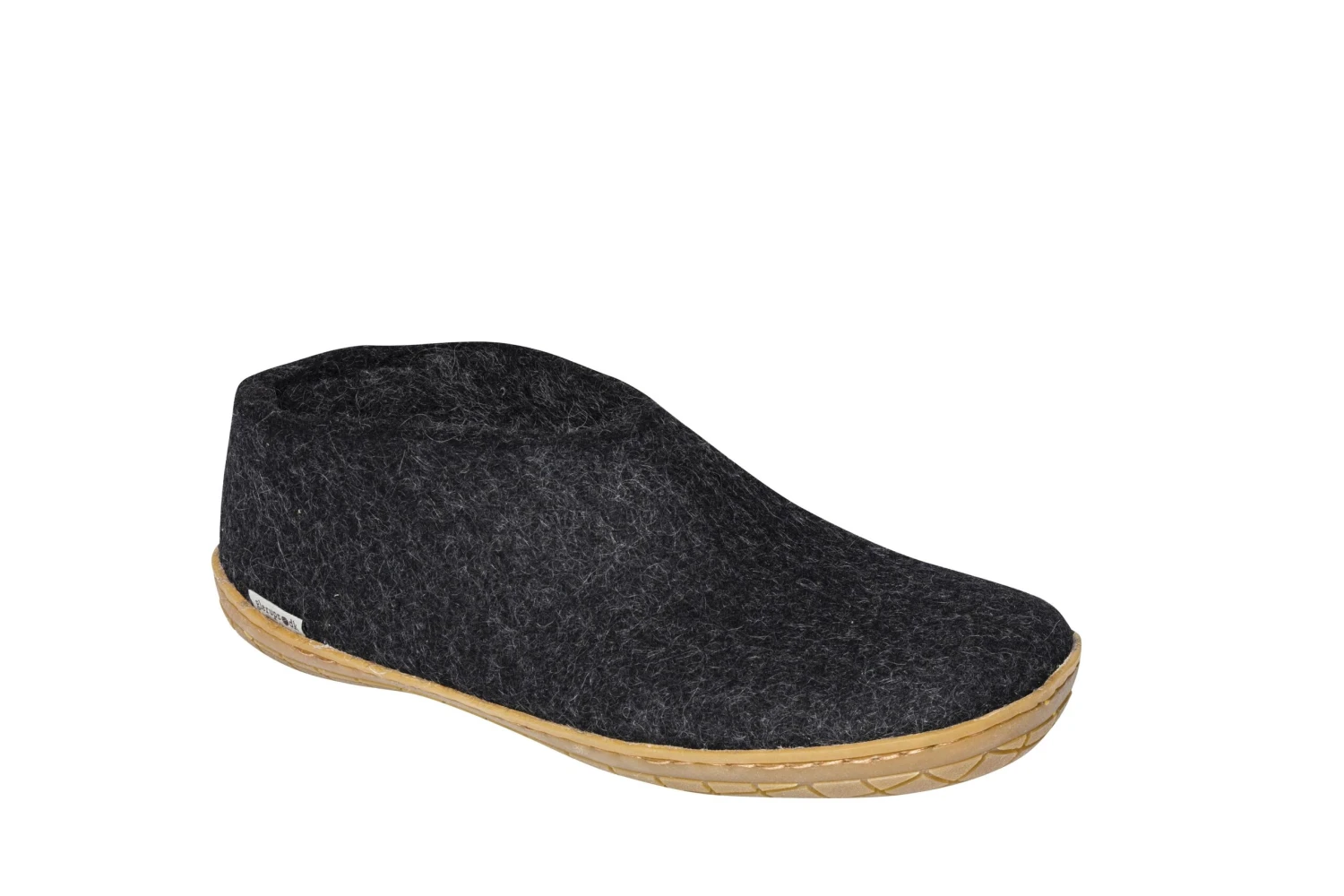 These wool charcoal shoes with a natural rubber sole are designed to envelope your feet in warm snug comfort. The Shoe Charcoal Rubber is made of natural wool and avoids unnecessary chemicals and uses only colours that are free of heavy metals and toxic dyes. Traditional felting craftsmanship and a sole of semi-vegetable tanned calfskin allows these slippers to adjust to your foot shape after just a few uses, making them more comfortable with each wear. These shoes are best worn sockless as the wool’s breathable moisture-wicking properties ensure less perspiration and a natural odor-free environment while the unique felting process removes the itch of wool keeping feet in blissful warm comfort. Inside, a double layer felted wool insole provides cushioning and enhanced durability. A lightweight flexible leather outsole delivers secure traction and ensures no static electricity is generated when worn.