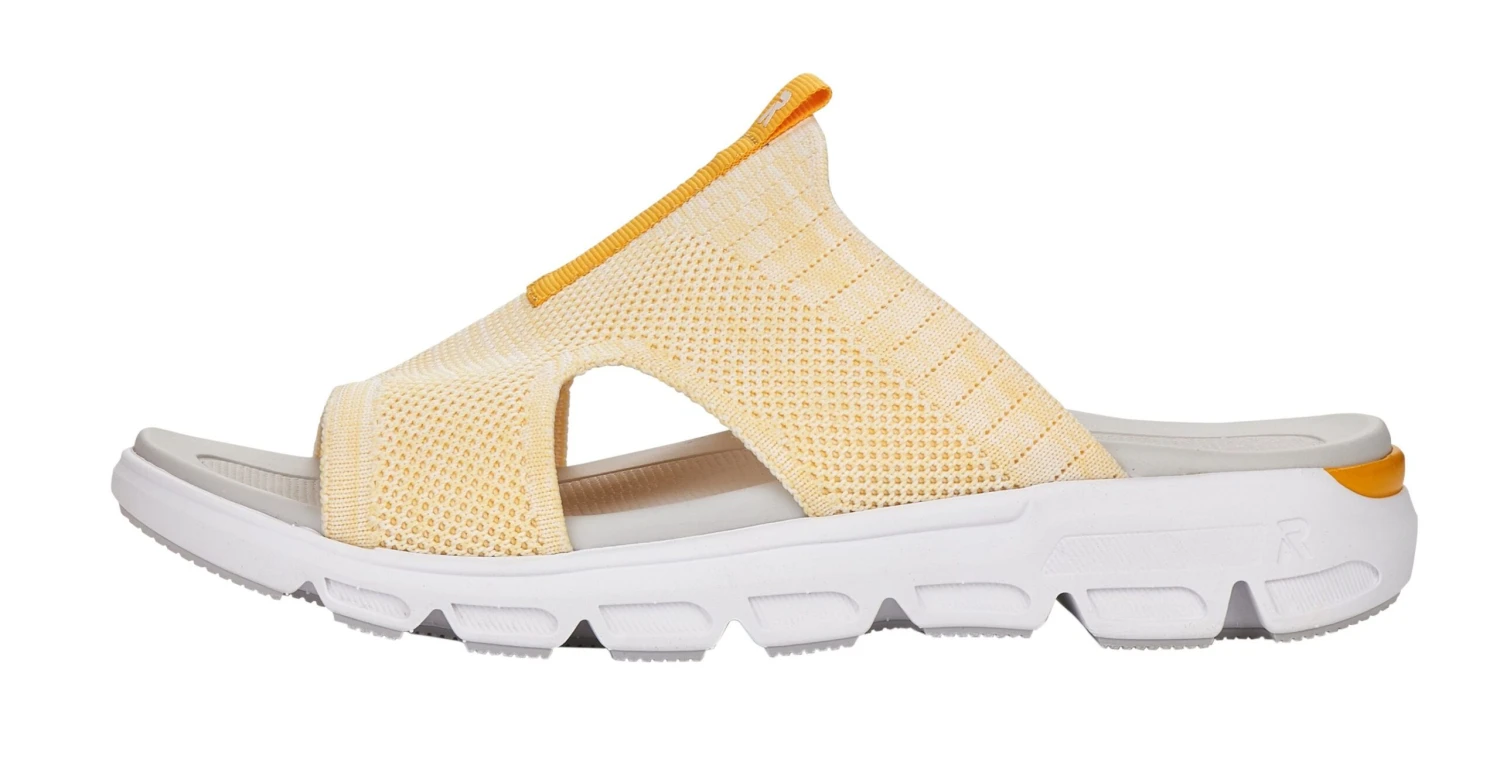 Just slip on and go with these lemon yellow slide sandals! These Knitup181 by R-Evolution from Rieker will be your go-to slide sandals this spring and summer. These sandals feature a soft textile upper in a knitted look with a contrasting white profile sole for a stylish look. A pull tab at the instep enables an easy on and off. A durable, lightweight, flexible rubber outsole provides stable shock-absorbing traction and guarantees exceptional comfort.
