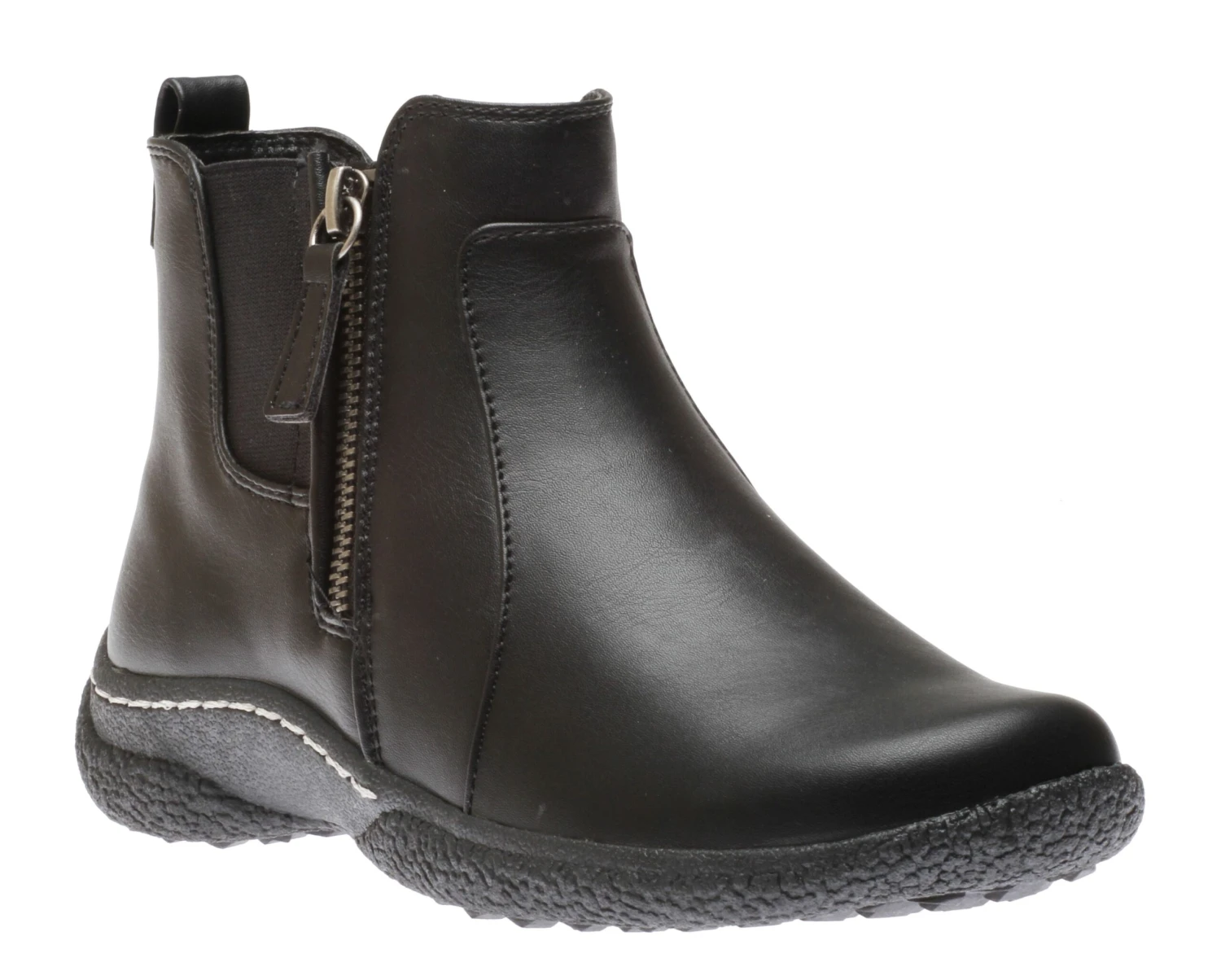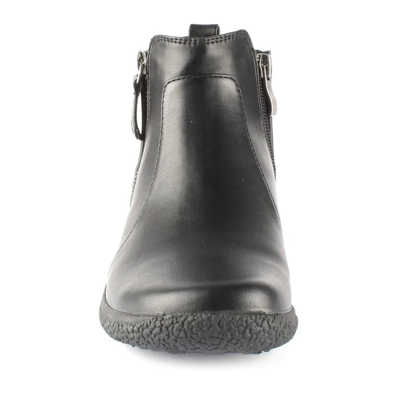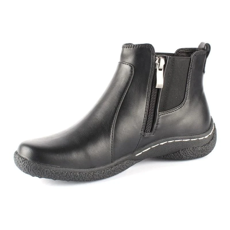 Keep it fashionable and functional this winter donning these Wanderlust’s Maddi black winter booties. The Maddi boot features a waterproof faux leather upper with round toe front, outside and inside zip details, convenient heel pull loop, flexible elastic goring, stitching accents and a patterned outsole.