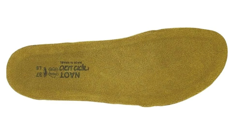 Naot’s Scandinavian Footbed is removable, anatomic and made of cork & latex covered in suede. This footbed molds to the shape of the foot with wear like a footprint in the sand.