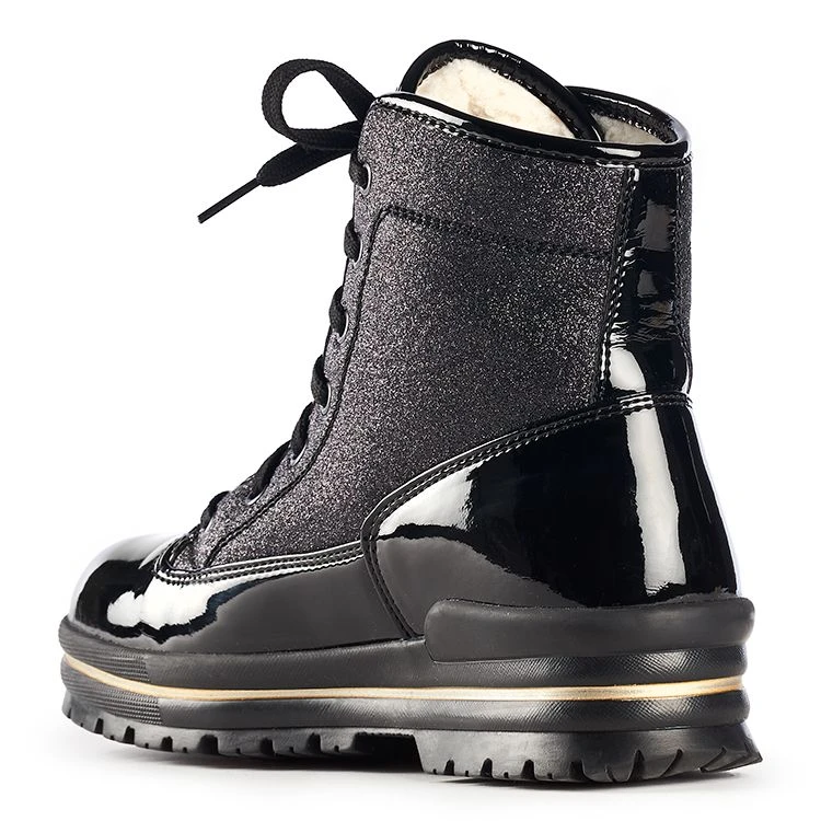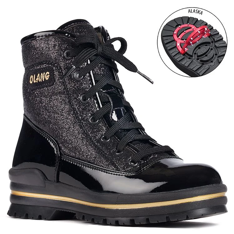 Add a touch of glitter and sparkle to your winter wardrobe! This winter boot marries Italian quality craftsmanship with a touch of modern glamour. It features an adjustable lace closure and a BREATHTEX waterproof membrane to ensure a dry fit. A breathable insulating OLANTEX film lining and an ISOWARM insole made of 90% wool with insulating and reflective silver foil keep feet in warm cushioned comfort. A blend of wool, polyester and imitation fur enhances warmth and breathability while a mid-sole guarantees impact and compression resistance. An Italian sole with 16 stainless steel spikes, built-in swiveling and folding OC System® with flow channel delivers secure non-slip grip and traction.