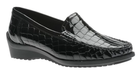 This sleek leather slip-on loafer features a reptilian print for enhanced sophistication. A cushioned insole provides comfort while a durable rubber sole delivers shock-absorbing traction. Heel height: 1.25 inches.