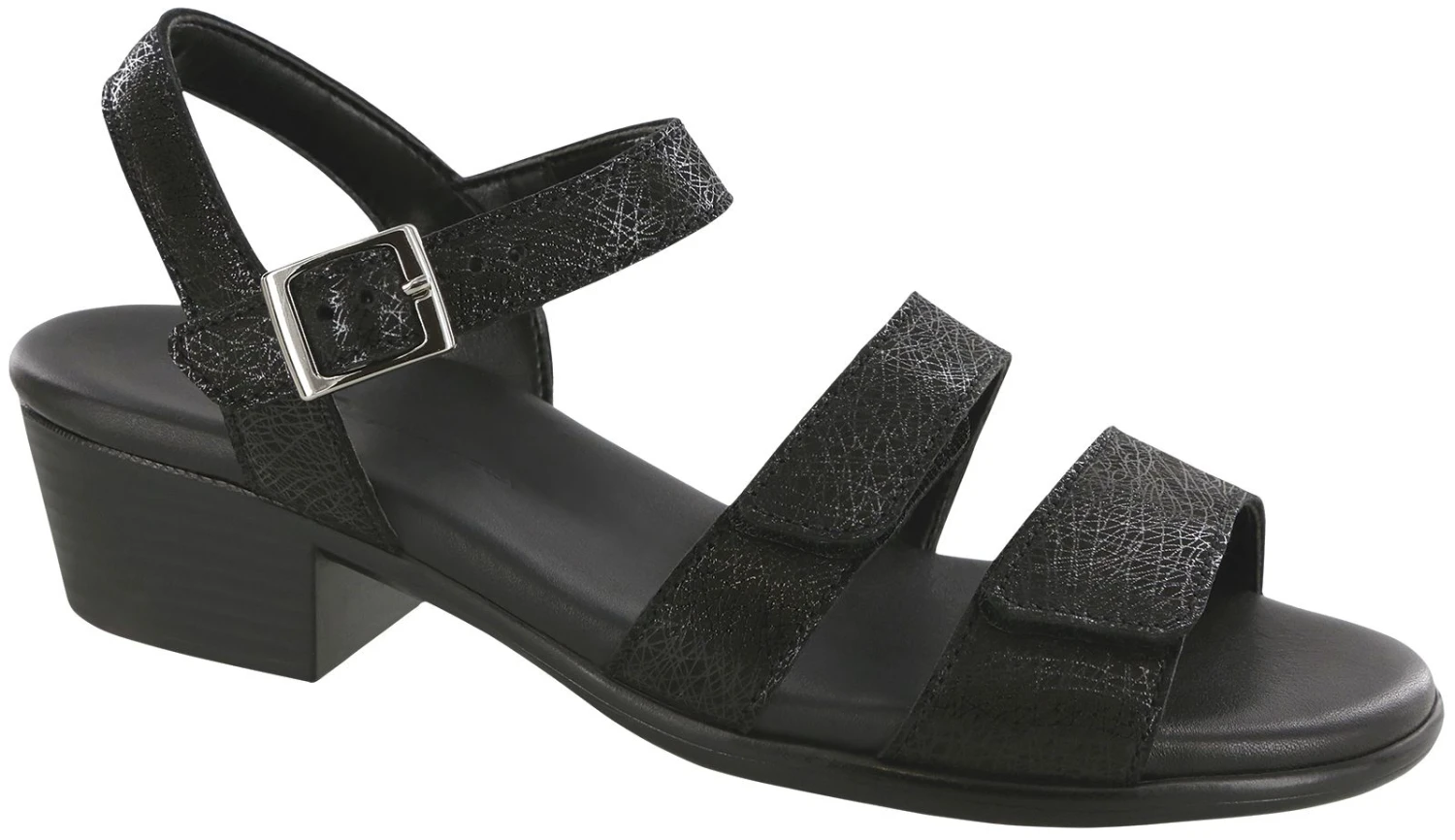 Classy, stylish, and comfortable for days like a Saturday afternoon shopping trip , the Savanna sandal sports eye-catching leather with a subtle web-like geometric design for a modern touch. With the comfort of a leather lining, two adjustable straps with Velcro closure at the forefoot and another strap with a buckle closure at the ankle ensure a secure custom fit. A generously cushioned insole molds to the shape of your foot for optimal comfort and support. A durable rubber outsole and block heel deliver stable traction.
