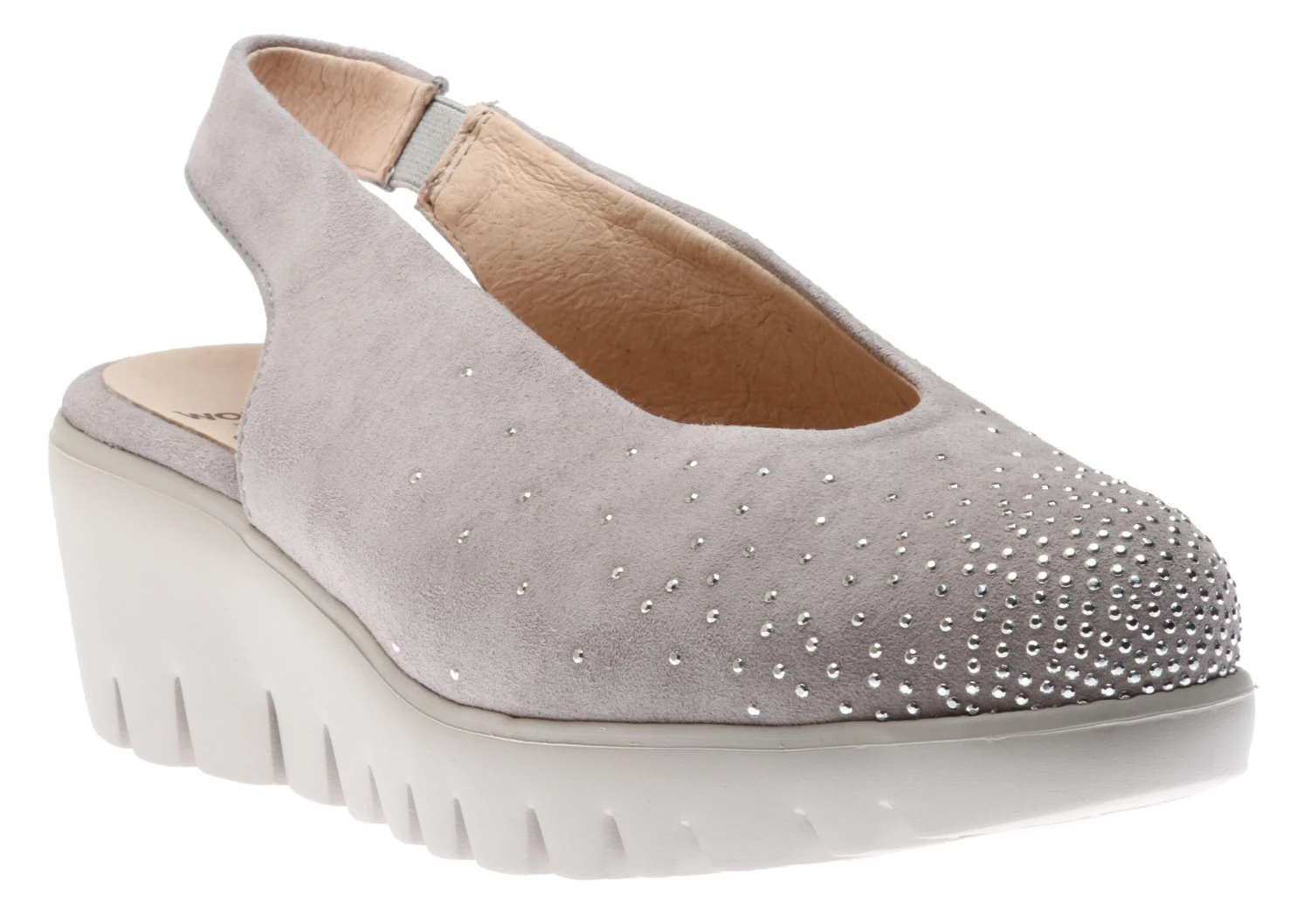 These sling-back platform wedge shoes feature a smooth leather upper with a round toe accented with crystals for a comfortable stylish fit. An elasticized sling-back strap ensures a secure fit and easy on-and-off. Inside, a leather and textile lining provide breathable comfort. A durable, lightweight, lugged, rubber outsole delivers shock-absorbing traction for a comfortable stride. Wedge height: 2 inches. Platform height: 1 inch. Made in Spain.